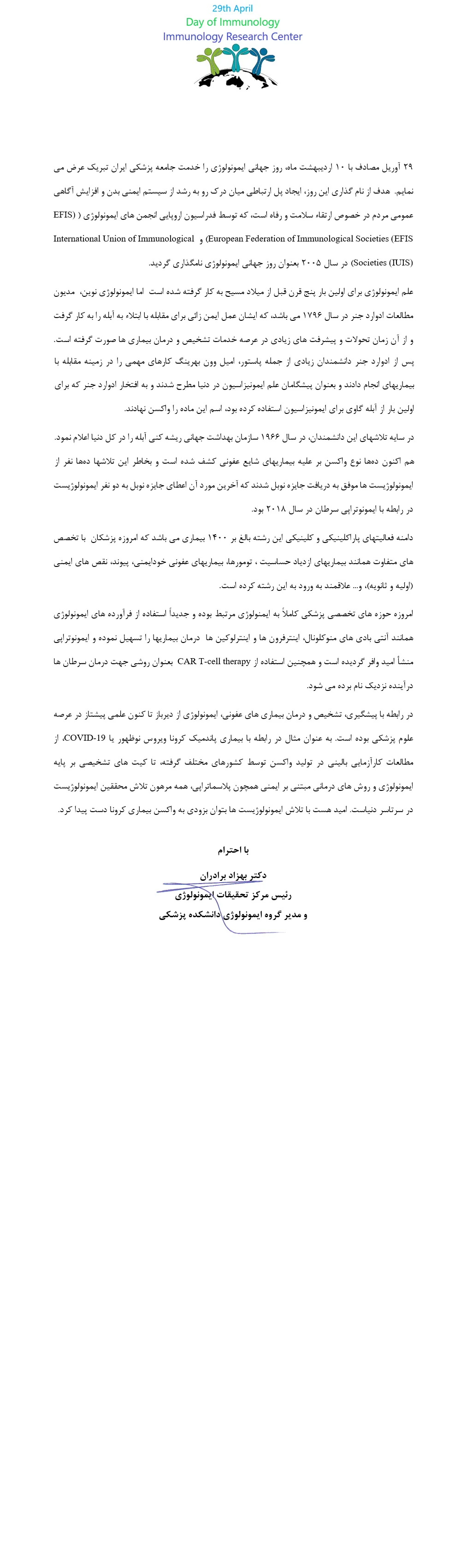 پیام تبریک جناب آقای دکتر بهزاد برادران رئیس مرکز تحقیقات ایمونولوژی و مدیر گروه ایمونولوژی به مناسبت گرامیداشت روز جهانی ایمونولوژی