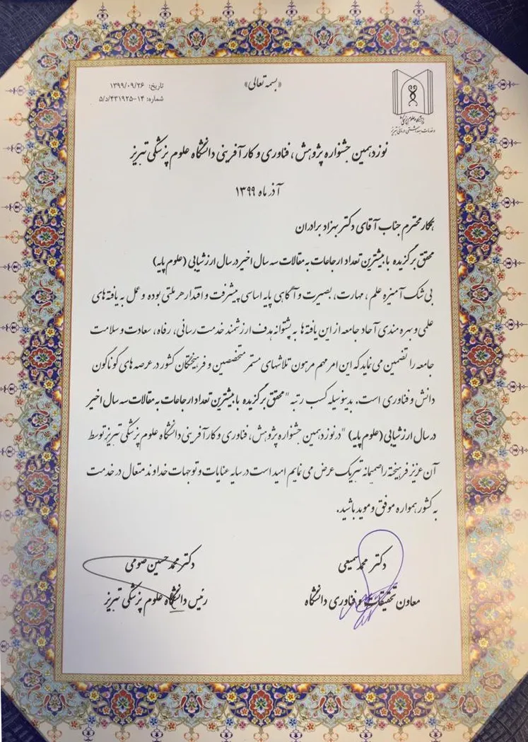 در نوزدهمین جشنواره پژوهش، فناوری و کارآفرینی دانشگاه علوم پزشکی تبریز، جناب آقای دکتر بهزاد برادران، رئیس مرکز تحقیقات ایمونولوژی، با بیشترین تعداد ارجاعات به مقالات سه سال اخیردر سال ارزشیابی (علوم پایه) به عنوان محقق برگزیده معرفی شدند
